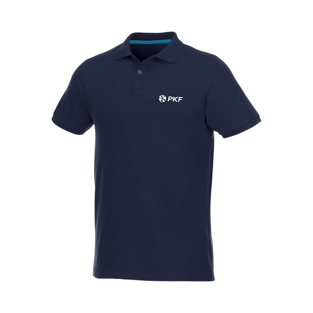 Sustainable promotional apparel. Sustainable metal buttons. Flat knit collar. Flat knit rib cuffs. Two button placket. Bi-coloured necktape. Double needle stitching detail. Piqué knit of 70% GOTS certified organic cotton and 30% GRS certified recycled polyester, 220 g/m2.