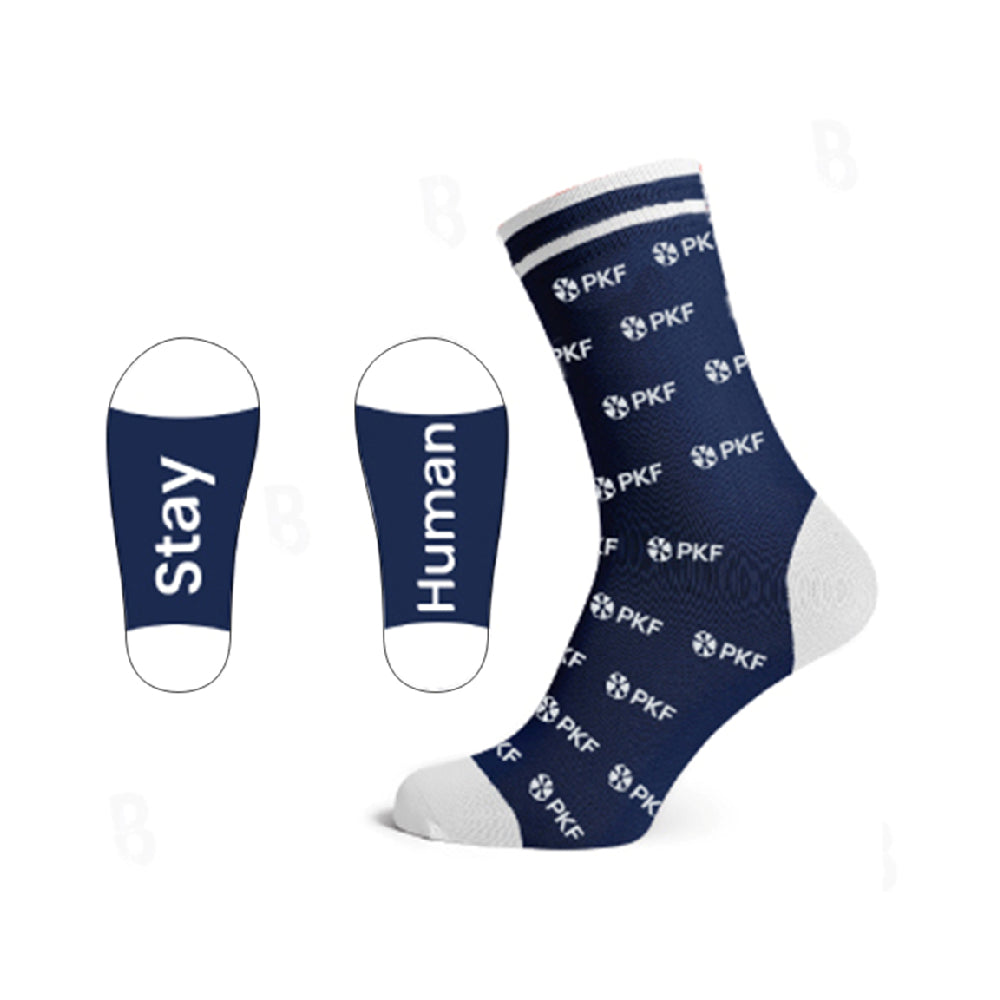 One pair of one size fits all socks with woven-in, jacquard design. Custom designs can be created with up to 3 PMS colors, 6 colors total, and bulk packaged.