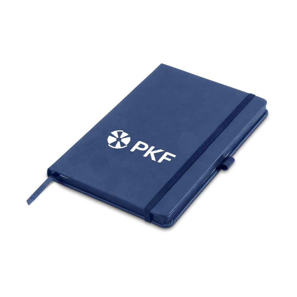 A navy PU A5 notebook which features a matching colour elastic closure, pen loop and ribbon bookmark. 80 lined pages. Size: 21 ( l ) x 14.3 (w ) x 1.5 ( h )